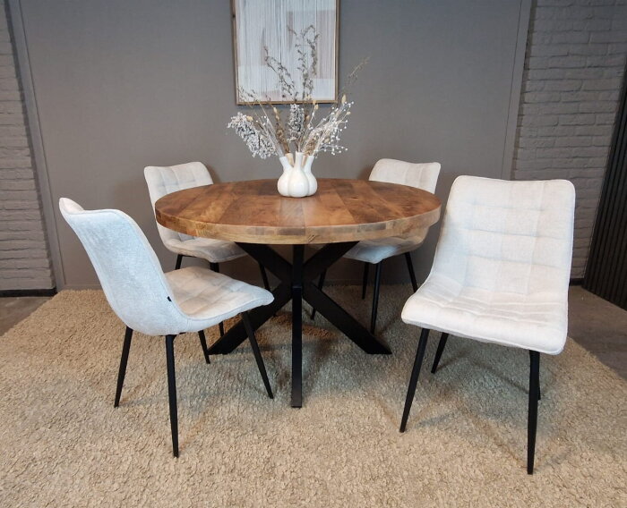 - Eettafel: ronde mangohouten eettafel 120 cm