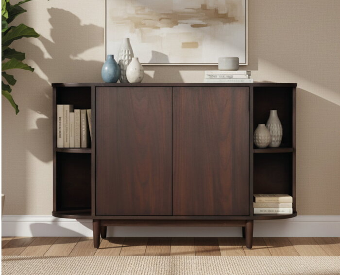 Dressoir Milla ademt rust en verfijning dankzij het uitgebalanceerde Japandi design en de warme, donkerbruine afwerking. De zachte rondingen, slanke poten en minimalistische belijning maken dit dressoir tot een stijlvol meubel dat moeiteloos sfeer en functionaliteit samenbrengt in je interieur. Perfect voor wie houdt van een opgeruimde ruimte met een natuurlijke uitstraling.