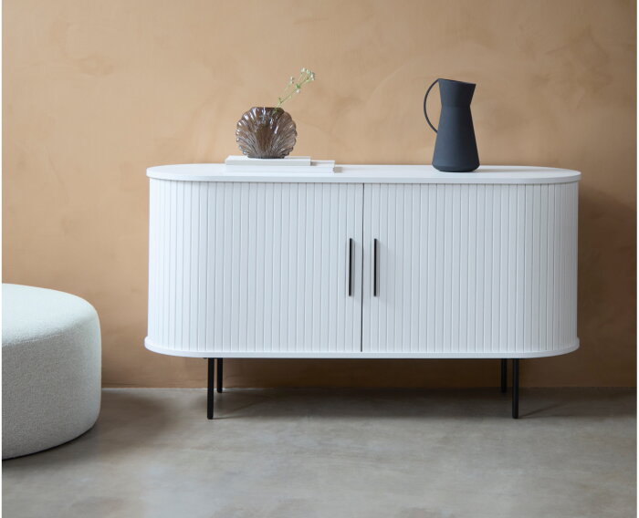 Achter de twee stijlvolle deuren schuilt voldoende opbergruimte voor servies, boeken of andere spullen. Dankzij de compacte afmetingen past dit dressoir in zowel grote als kleinere ruimtes. De afgeronde vorm voorkomt scherpe hoeken en draagt bij aan een zachte, vriendelijke look.