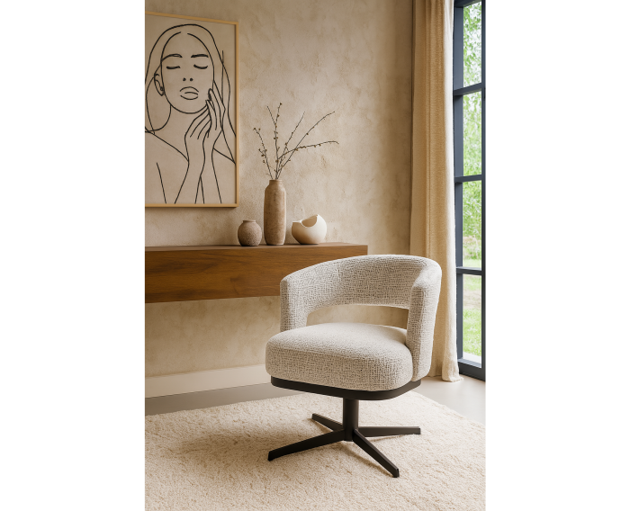 De Bruce eetkamerstoel is een stijlvolle en comfortabele toevoeging aan elke ruimte. Deze moderne eetkamerstoel is ontworpen met een zachte, geweven bekleding die zorgt voor een warme en tijdloze uitstraling. Het slanke, zwarte metalen onderstel heeft een praktische 360° draaifunctie, waardoor de stoel flexibel en veelzijdig is. De Bruce stoel combineert elegantie met functionaliteit, wat hem geschikt maakt voor zowel eetkamers als werkruimtes. Dankzij het tijdloze design past deze stoel moeiteloos in diverse interieurstijlen.