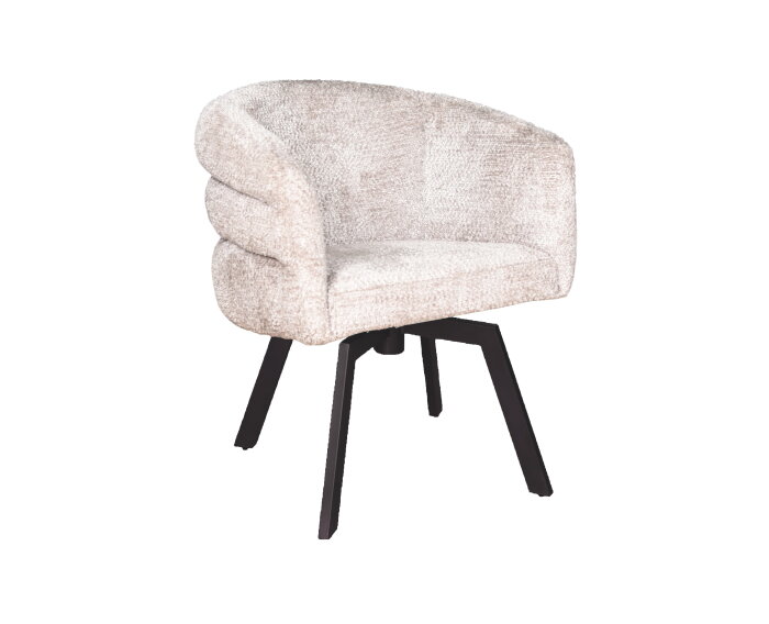 Imola onderscheidt zich door zijn luxe vormgeving en uitnodigende comfort. De geplooide rugleuning voegt een speels detail toe, terwijl de zachte stof en ergonomische kuipvorm zorgen voor een aangename zitervaring. De subtiele rondingen geven de stoel een moderne en vriendelijke uitstraling.