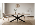 Het Deens ovale tafelblad kenmerkt zich door zijn zachte, organische vormen die zorgen voor een elegante en ruimtelijke uitstraling. Het mangohout is afgewerkt in een lichte ashblond tint, waardoor de natuurlijke houtstructuur subtiel zichtbaar blijft en het geheel een frisse, moderne look krijgt. Het zwarte metalen onderstel met kruispoot geeft de tafel een krachtig contrast en zorgt voor een eigentijdse touch die perfect past in zowel moderne als Scandinavische interieurs.