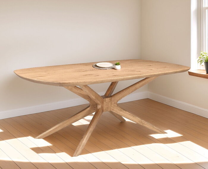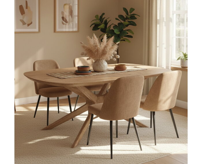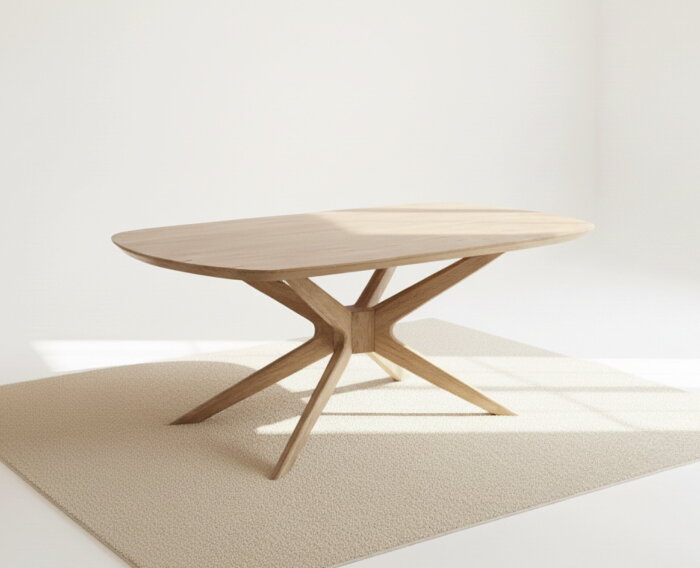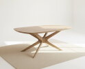 Eettafel Evi is vervaardigd uit hoogwaardig eikenhout, met een solide blad van 4 cm dik. De naturel afwerking benadrukt de warme houtstructuur en geeft de tafel een zachte, rustige uitstraling. De Deens ovale vorm brengt elegantie en organische lijnen in de ruimte, terwijl het sculpturale spinpoot-onderstel van eikenhout zorgt voor een moderne, luchtige look.