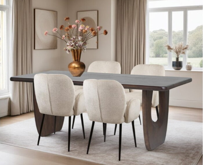 De Eettafel Handai is vervaardigd uit duurzaam mangohout en heeft een strak, rechthoekig ontwerp dat de natuurlijke houtnerf prachtig benadrukt. Het massieve hout is zorgvuldig geselecteerd om een verfijnde en consistente uitstraling te bieden, terwijl de walnootkleurige lak de tafel een luxe en warme uitstraling geeft. De poten van de tafel kunnen op twee verschillende manieren bevestigd worden, wat zorgt voor flexibiliteit in de look en opstelling van de tafel. De stevige constructie maakt deze tafel niet alleen geschikt voor dagelijks gebruik, maar ook voor speciale gelegenheden.