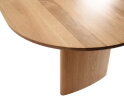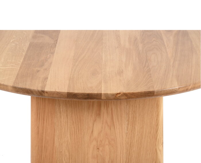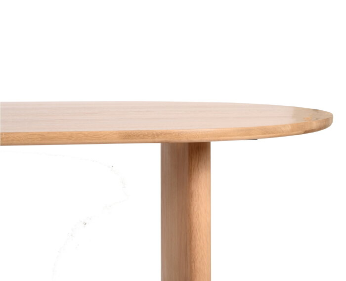 Eettafel Lazlo is vervaardigd uit eikenhout en uitgevoerd in een lichte, natuurlijke tint die de houtstructuur mooi zichtbaar laat. Het ovale tafelblad geeft de tafel een zachte, organische uitstraling en zorgt voor een harmonieuze balans tussen modern en tijdloos design. De robuuste, afgeronde poten sluiten perfect aan bij het blad en versterken het rustige karakter van de tafel.