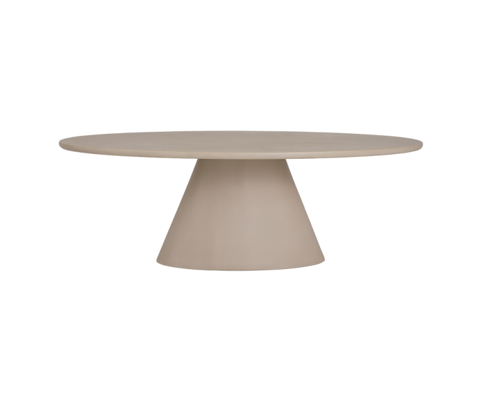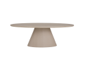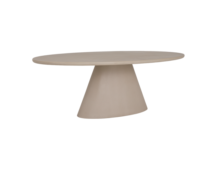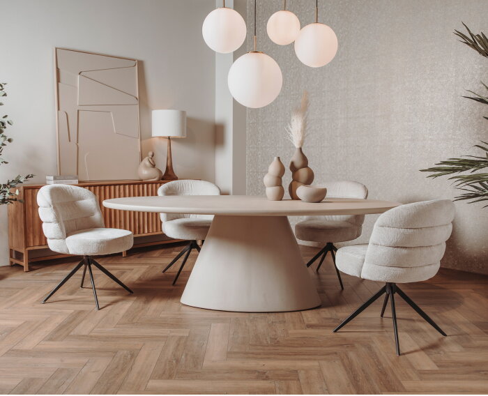 Breng rust, elegantie en moderne verfijning in je interieur met de ovale Mello eettafel. Deze eigentijdse tafel is vervaardigd van hoogwaardig materiaal in betonlook, uitgevoerd in stijlvol mat beige. Het vloeiende ovale blad rust op een opvallend schuin geplaatste, kegelvormige poot die zorgt voor een subtiel designstatement zonder aan stabiliteit in te boeten. Dankzij het zachte kleurgebruik en de afgeronde vormen ademt de tafel kalmte en harmonie. Verkrijgbaar in meerdere afmetingen (200, 220 en 240 cm), is de Mello ideaal voor zowel intieme diners als royale bijeenkomsten.