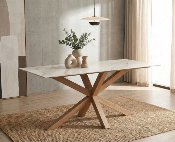 Het tafelblad is uitgevoerd in hoogwaardig keramiek met een glanzende witte afwerking. Dit materiaal geeft de tafel een luxe uitstraling en laat het oppervlak mooi reflecteren in het licht. Het onderstel van naturel eikenhout is kruislings geplaatst en zorgt voor een luchtig, architectonisch design met een stabiele basis. De combinatie van keramiek en hout maakt de Ravello geschikt voor zowel moderne als Scandinavische interieurs.