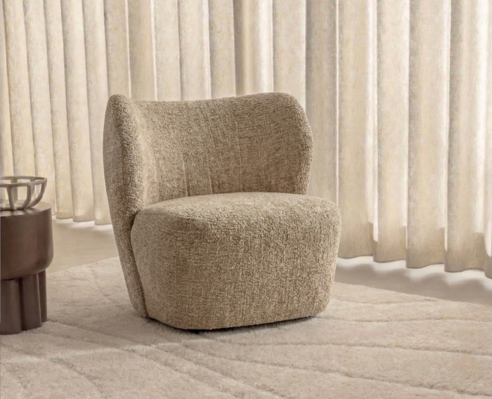 Fauteuil Riley valt op door zijn organische vormen en afgeronde lijnen, die zorgen voor een zachte en moderne uitstraling. De volledig gestoffeerde afwerking geeft de stoel een luxe en warme look, terwijl de subtiel gemêleerde stof zorgt voor extra diepte en karakter. Verkrijgbaar in drie tijdloze kleuren – beige, grijs en naturel – waardoor je eenvoudig de perfecte match vindt voor jouw interieur.