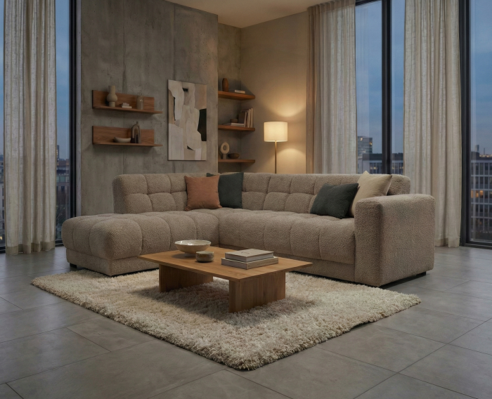 Hoekbank Cosy heeft een modern, zacht design met afgeronde lijnen en volle kussens. De stof Egon 40 heeft een fijne structuur en voelt aangenaam aan. De taupekleur zorgt voor een warme, neutrale uitstraling die zich moeiteloos laat combineren met verschillende interieurstijlen. De lage, brede vormgeving versterkt het loungegevoel en maakt de bank geschikt voor zowel moderne als rustige woonomgevingen.