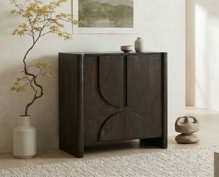 Kabinetkast Zana is uitgevoerd in massief mangohout en sluit perfect aan bij de Japandi woonstijl, waarin minimalisme en natuurlijke materialen centraal staan. De diepe bruine kleur en zichtbare houtnerf geven het meubel een warme, rustige uitstraling. De subtiele, organische vormen in de kastdeuren zorgen voor een verfijnd design dat eenvoud en elegantie uitstraalt. Dankzij het ambachtelijke karakter is elk meubel uniek, met natuurlijke variaties die bijdragen aan de authentieke look.