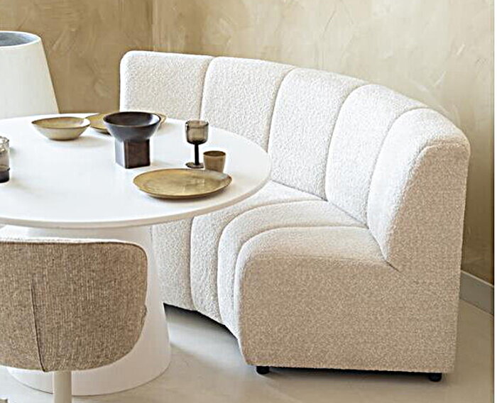 Esther is modulair opgebouwd, zodat je de bank moeiteloos kunt samenstellen naar wens en ruimte. Perfect voor een eethoek met ronde of ovale tafel, maar ook ideaal voor grotere eetkamers waarin gezellig tafelen centraal staat. De hoge rugleuning biedt extra ondersteuning, terwijl de compacte diepte zorgt dat je comfortabel en rechtop zit tijdens het eten.