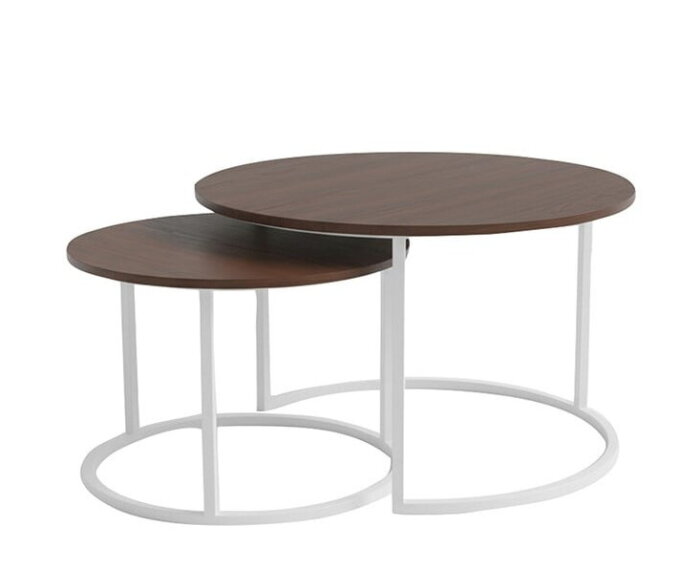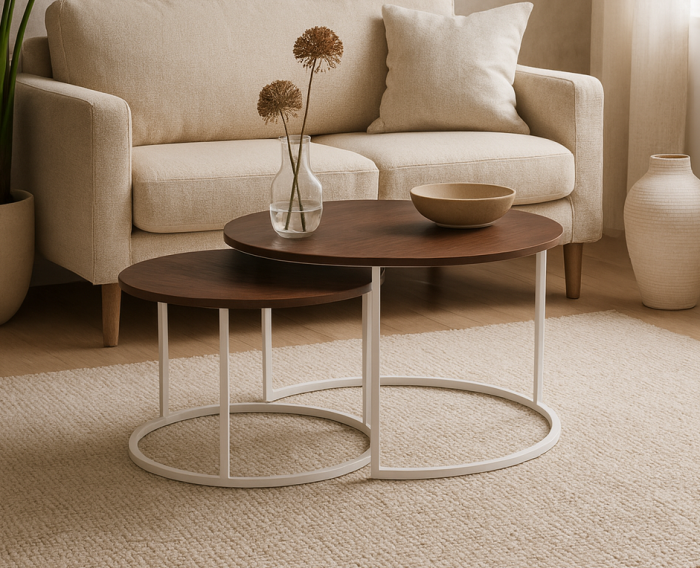 Breng warmte en verfijning in je woonkamer met deze stijlvolle set van twee ronde salontafels. De combinatie van warm walnootkleurig mangohout en een luchtig beige metalen frame geeft je interieur een moderne, elegante uitstraling. Dankzij het speelse verschil in hoogte schuif je de tafels eenvoudig onder elkaar voor een dynamisch geheel dat perfect past in zowel een minimalistische als een gezellige woonstijl.