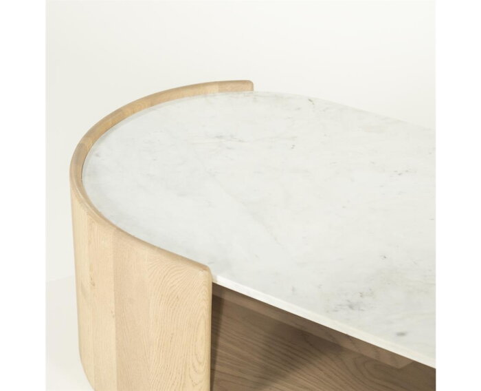 De salontafel Don is een toonbeeld van modern design met een natuurlijke twist. Het verfijnde marmeren blad vormt een prachtig contrast met de warme gloed van het eikenhouten onderstel. De ronde vormen en open structuur zorgen voor een luchtige, harmonieuze uitstraling. De gelakte afwerking beschermt het oppervlak en accentueert de natuurlijke schoonheid van het hout.