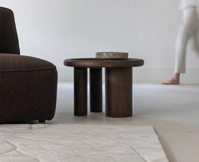 Salontafel Marlot combineert natuurlijke materialen met een speels en organisch ontwerp. Het ronde blad heeft een subtiel opstaande rand, wat zorgt voor zowel een decoratief detail als praktische functionaliteit. De drie stoere, ronde poten van massief mangohout zijn een echte blikvanger en geven de tafel een sculpturale uitstraling. De donkere walnootfinish brengt warmte en diepte in het hout, waardoor Marlot perfect aansluit bij Japandi, modern of hotel chic interieurs.
