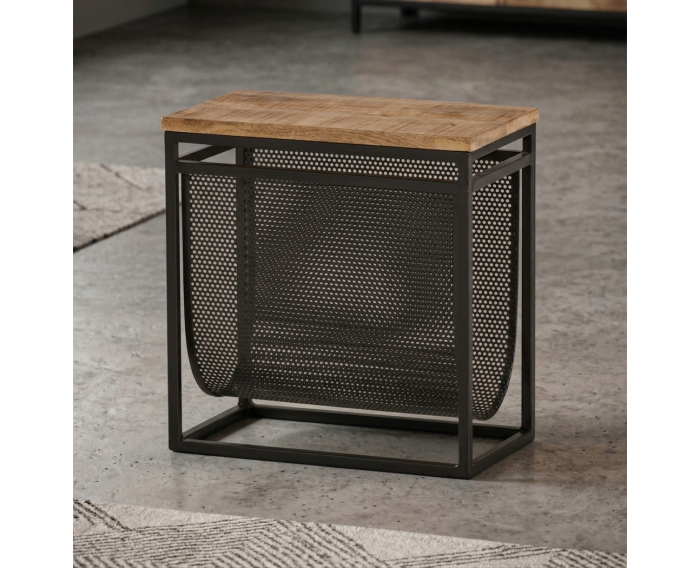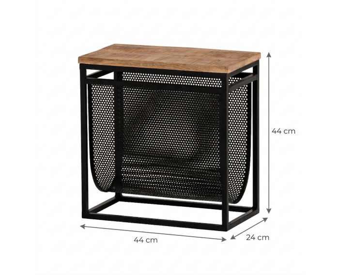 Het Tijdschriftenrek met mandje is ontworpen met oog voor detail en duurzaamheid. Het mangohouten blad straalt natuurlijke warmte uit, terwijl de gladde lakafwerking de unieke houtstructuur benadrukt. Het geperforeerde metalen mandje en het strakke frame voegen een modern industrieel accent toe, waardoor dit rek een echte blikvanger is.