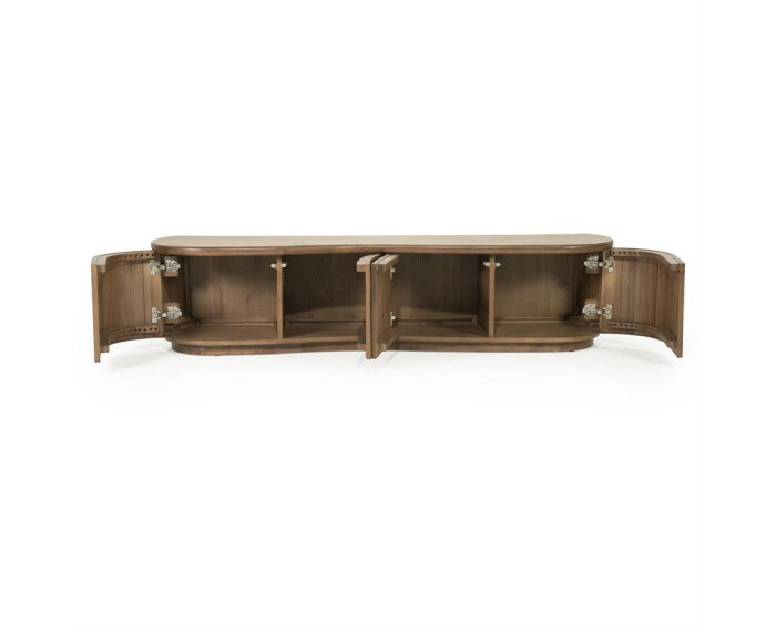 Achter de vier deuren biedt TV-meubel Josh praktische opbergruimte voor elektronica, kabels en accessoires. De ruime indeling zorgt ervoor dat alles netjes uit het zicht blijft, terwijl de brede bovenkant voldoende plek biedt voor een televisie tot circa 75 inch. Dankzij de afgeronde vormen oogt het meubel luchtig en vriendelijk, ideaal voor een stijlvolle en gezellige woonkamer.