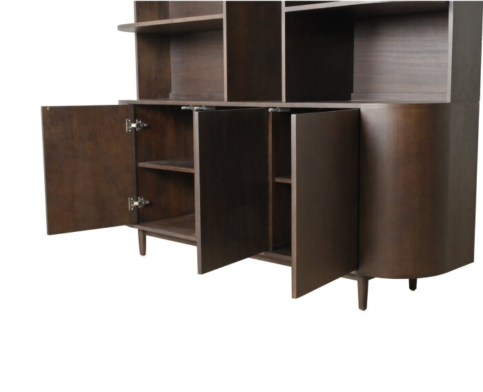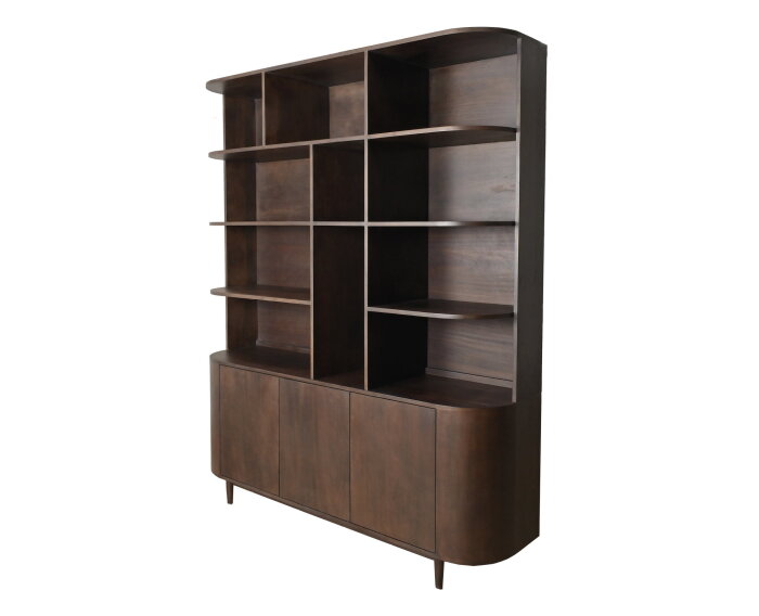 Bovenin bieden ruime open vakken plaats aan boeken, kunstobjecten, planten of zorgvuldig gekozen woonaccessoires. Het brede centrale vak en de diverse hoogte‑indelingen maken het makkelijk om items te rangschikken zonder rommelig te lijken. Onderin verbergen drie deuren flinke opbergruimte, ideaal voor spullen die je liever uit het zicht houdt: servies, documenten, media of andere woonitems. Door het grote formaat is dit zowel een presentatie‑ als opbergmeubel voor een ruime woonkamer, eetkamer of kantoor, zonder concessies aan stijl.