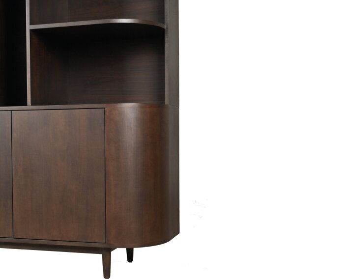 De kast heeft een elegante, afgeronde buitenvorm met een minimalistisch front dat rust uitstraalt. De warme, donkerbruine afwerking accentueert de natuurlijke houtstructuur en past perfect binnen het Japandi‑palet van rustige, aardse tinten en donker hout. De slanke, taps toelopende poten zorgen voor visuele lichtheid, waardoor de kast ondanks zijn hoogte en breedte niet massief oogt. De vakken zijn symmetrisch en toch levendig ingedeeld, waardoor het geheel evenwichtig én interessant blijft om naar te kijken.